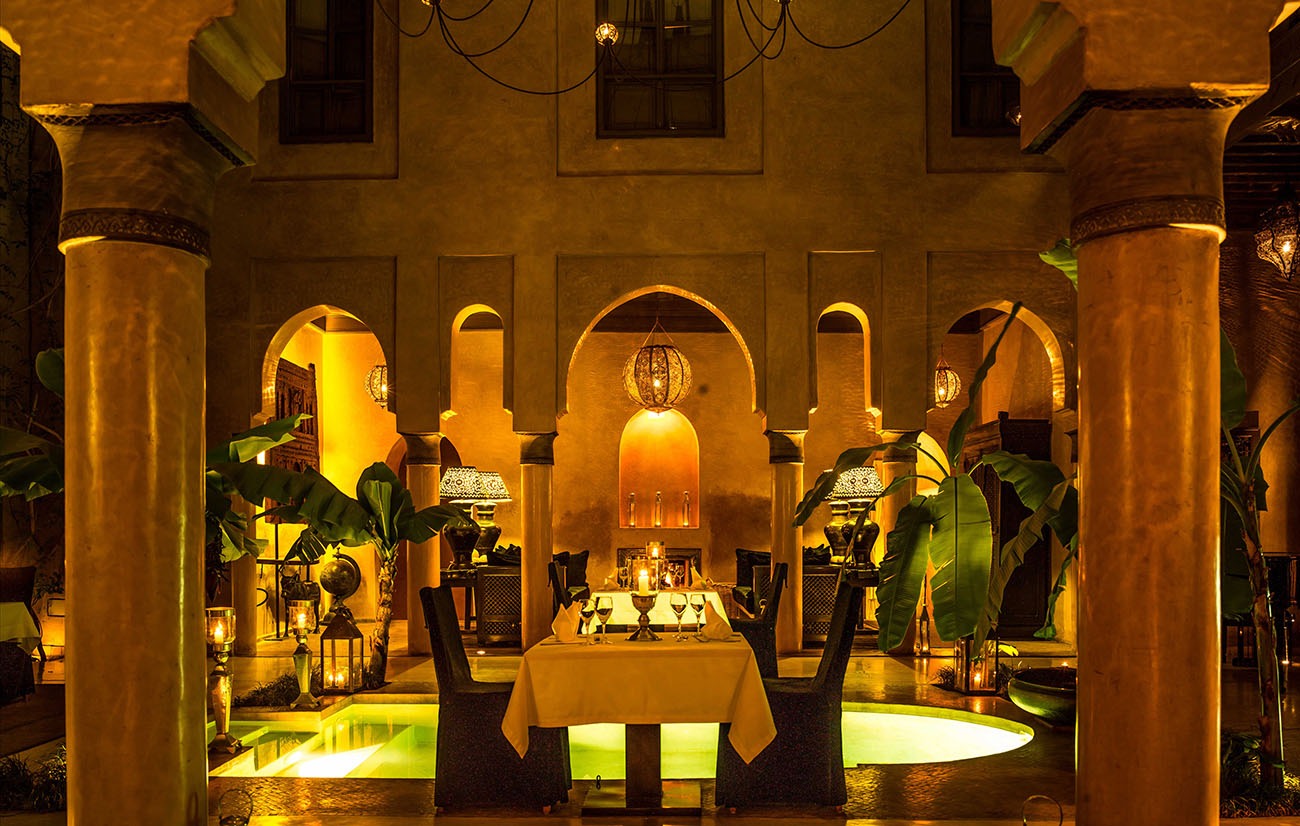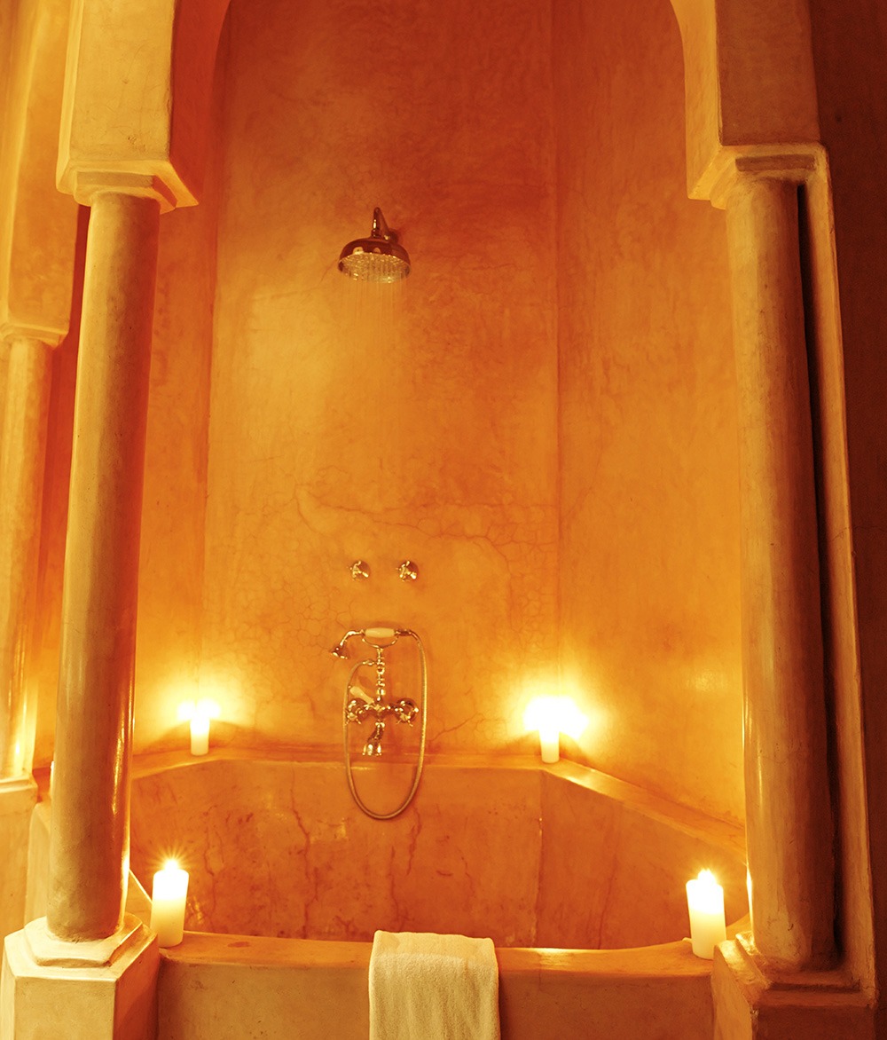The delightful Master Suite Chameau (76m²) is situated in the Winter Courtyard and boasts the second-largest living space (56m²) with lounging sofas and a fireplace. The suite features a stunning Moroccan tadelakt columned bath and a private balcony overlooking the courtyard. The warm and light suite even features its own camel.
