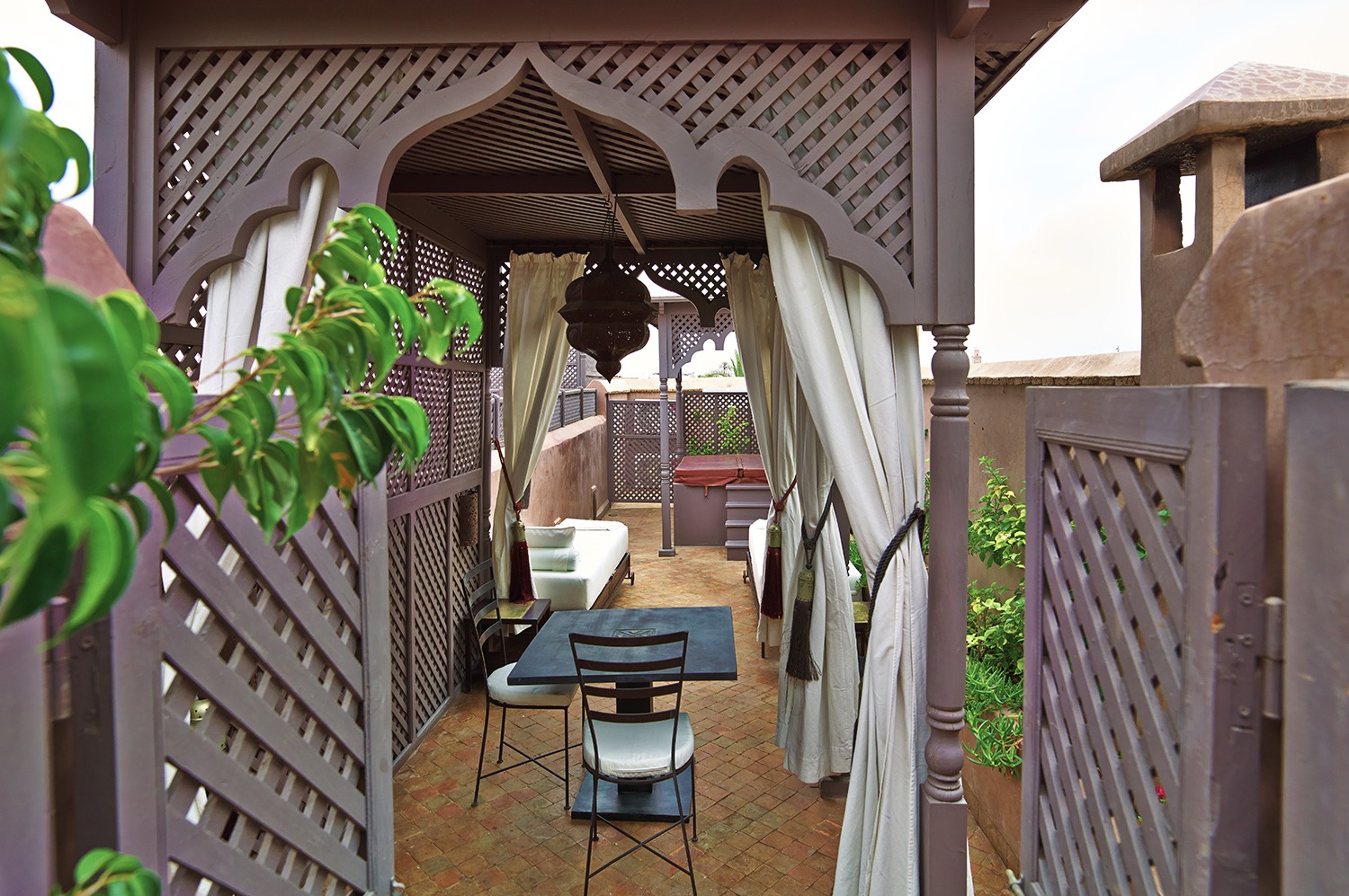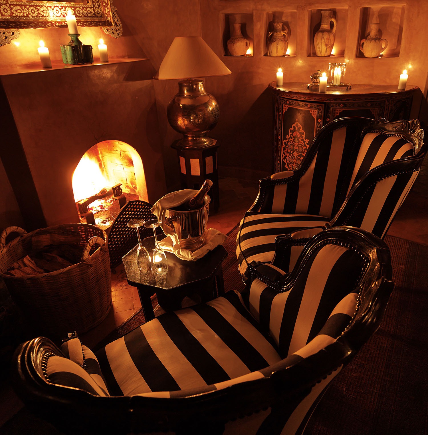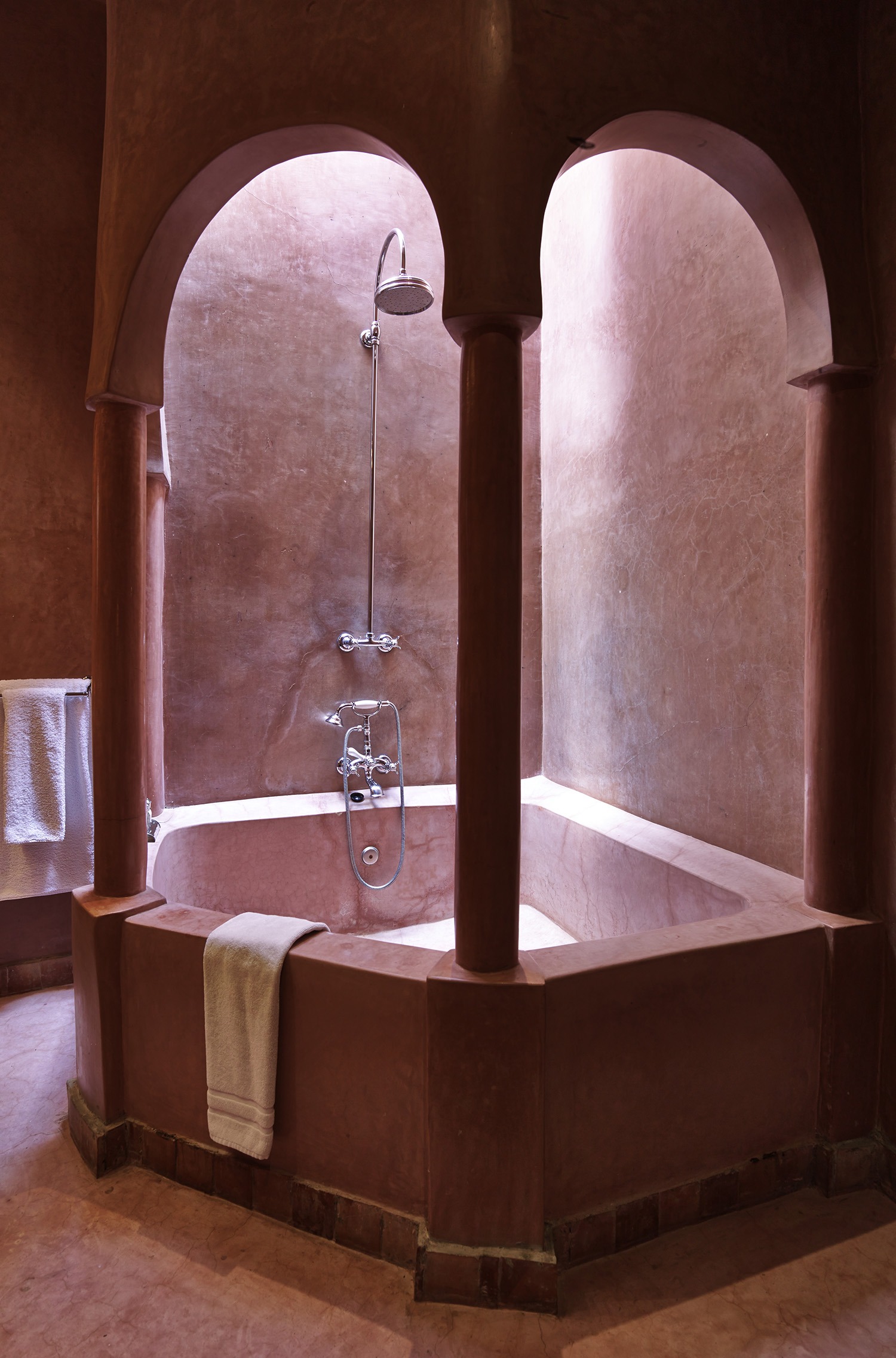 The Zèbre Master Suite (80m²) offers a unique blend of contemporary and traditional Moroccan design. It features a spacious bedroom, a luxurious bathroom with a bathtub and separate shower, and a private terrace with a jacuzzi and sunbeds. The suite also includes a fireplace, a seating area, and offers views of the Summer Courtyard.