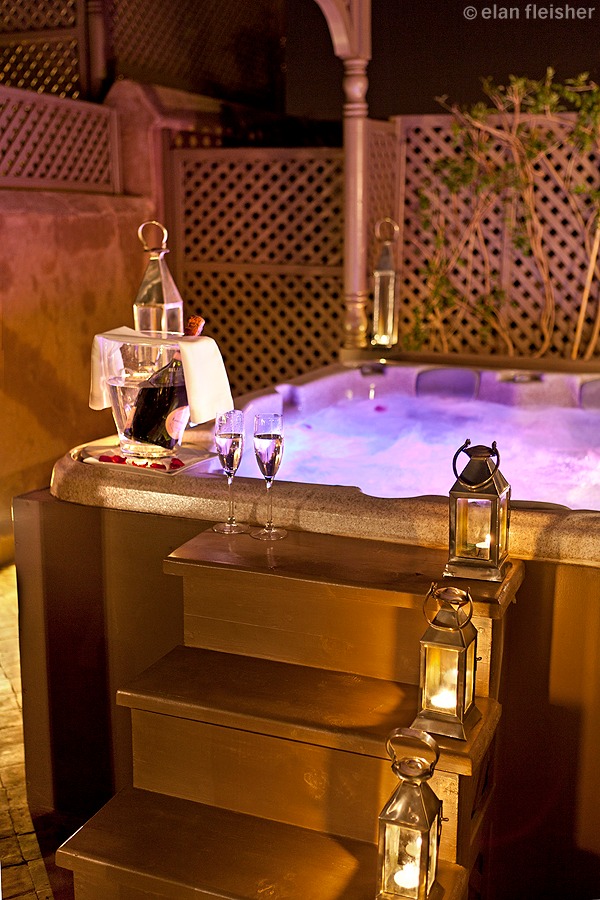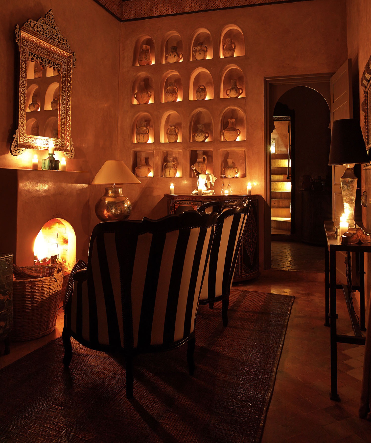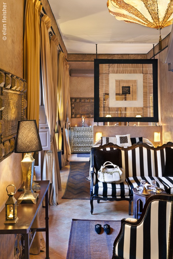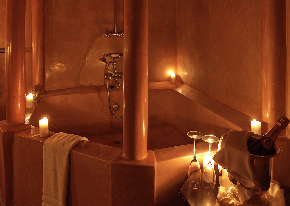 The Zèbre Master Suite (80m²) offers a unique blend of contemporary and traditional Moroccan design. It features a spacious bedroom, a luxurious bathroom with a bathtub and separate shower, and a private terrace with a jacuzzi and sunbeds. The suite also includes a fireplace, a seating area, and offers views of the Summer Courtyard.
