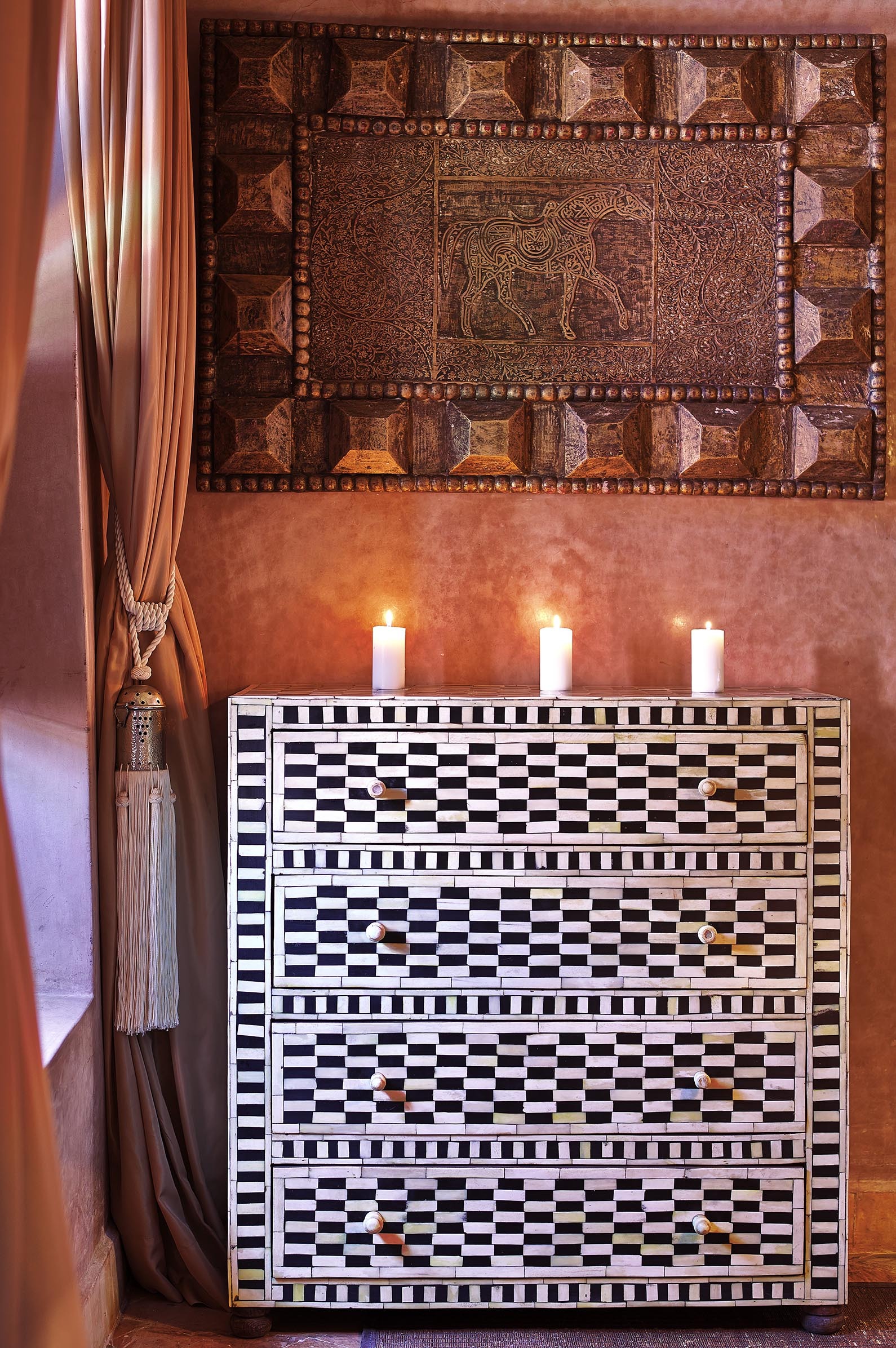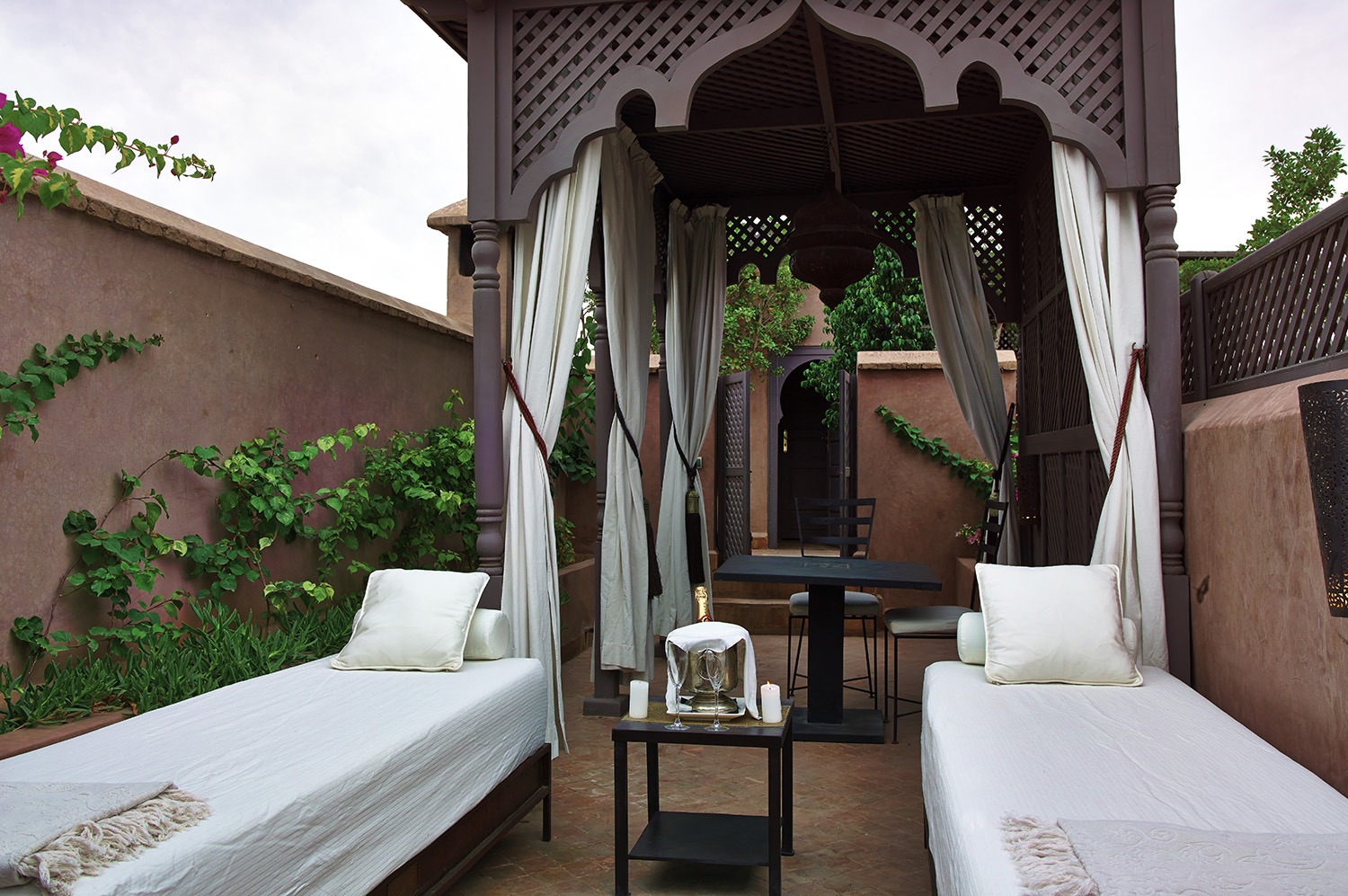 The Zèbre Master Suite (80m²) offers a unique blend of contemporary and traditional Moroccan design. It features a spacious bedroom, a luxurious bathroom with a bathtub and separate shower, and a private terrace with a jacuzzi and sunbeds. The suite also includes a fireplace, a seating area, and offers views of the Summer Courtyard.